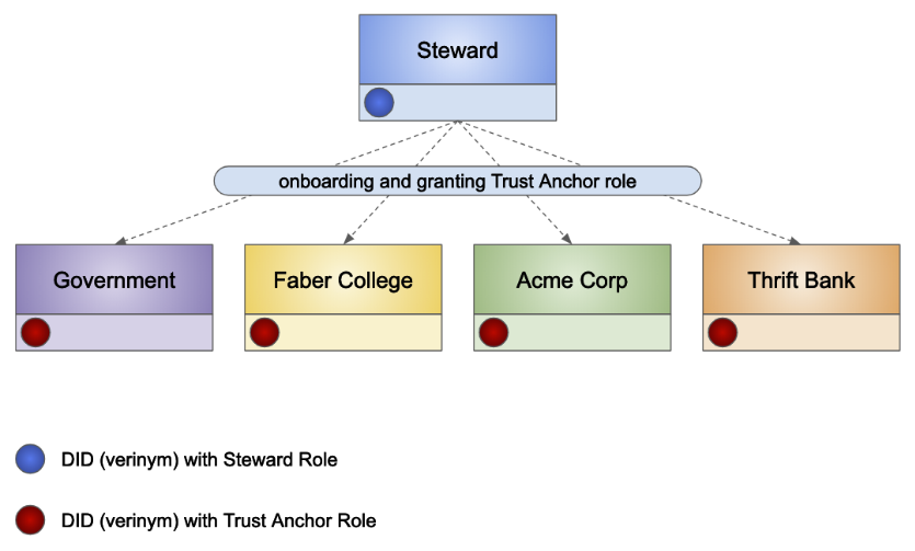 Steward 는 분산되어 DID 관련 데이터를 블록체인에 저장/읽기 한다. Steward는 참여하는 모든 actor (Trust Anchor) 들을 생성할 수 있고 각 actor마다 적당한 역할을 부여한다.