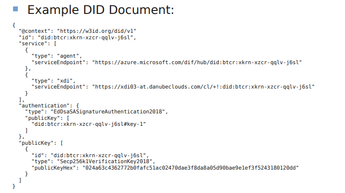 DID Docuement에는 주로 해당 DID를 어떻게 검증 할 수 있는지에 대해서 나와있다. DID가 진짜 그 사람의 소유인지를 확인하려면 DID의 쌍인 Private key를 가지고있는지 확인하면 된다. Document에 있는 DID 소유자의 끝점을 통해 테스팅 할 수 있다. 또한 DID의 소유를 확인하기 위해서는 단일소유주 뿐만아니라 다양한 방식으로 테스트 할 수 있는데 예를들어 소유자가 회사의 구성원이라면 회사가 대신해서 검증 해 줄 수 도 있을 것이다.