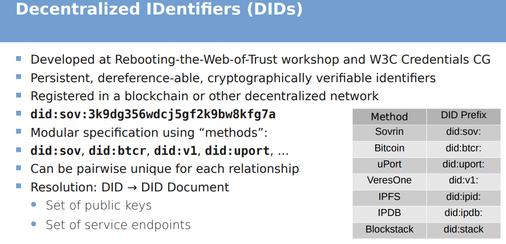 각 DID는 주어진 네트워크에 특정한 method 사양과 연관되어 있으며, DID method 는 해당 네트워크에서 DID가 등록, 확인, 업데이트 및 해지되는 방법에 대한 규칙을 지정합니다.