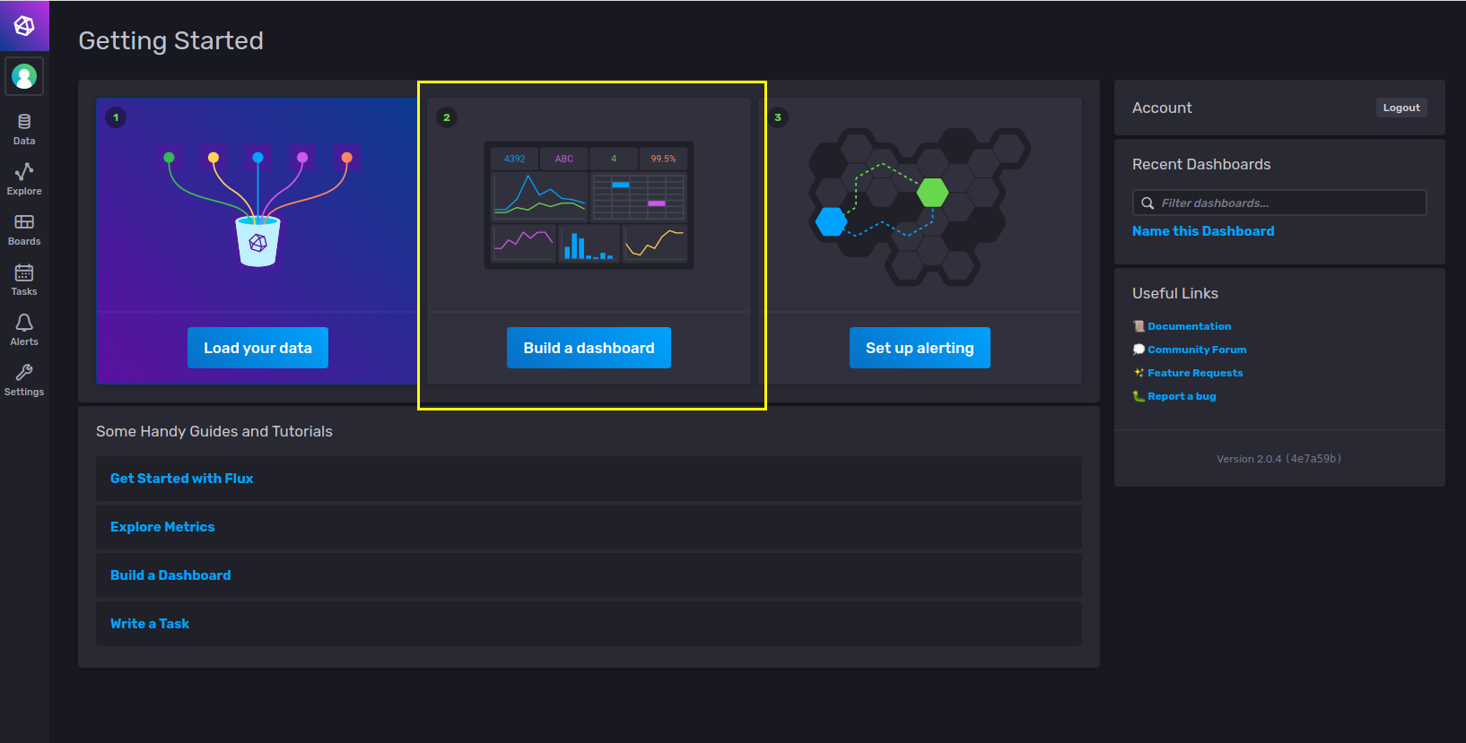3. 메인 화면에서 Build a dashboard 를 선택한다.