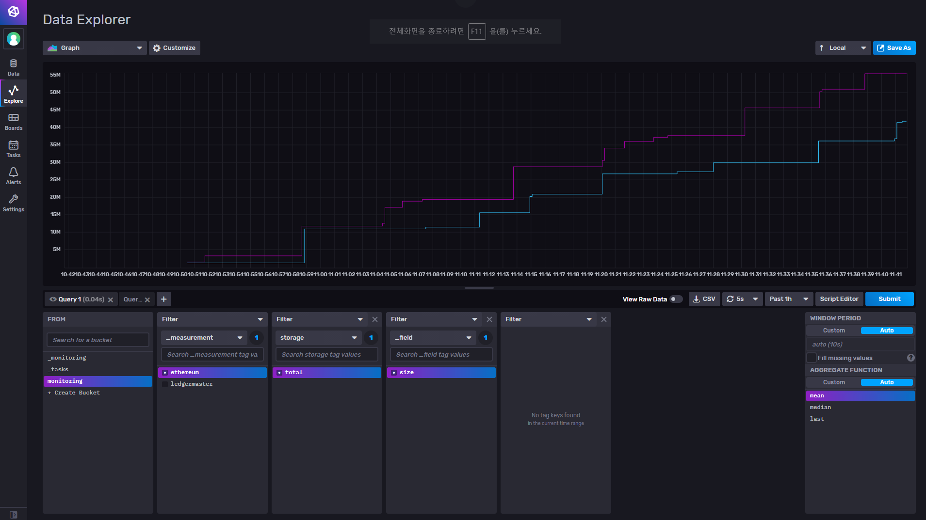 - 1분간의 데이터를 평균(mean)하여 가져온다. (즉 그래프에는 1시간 전부터 시작하여 1분당 한개의 값만 나올 것이다.)