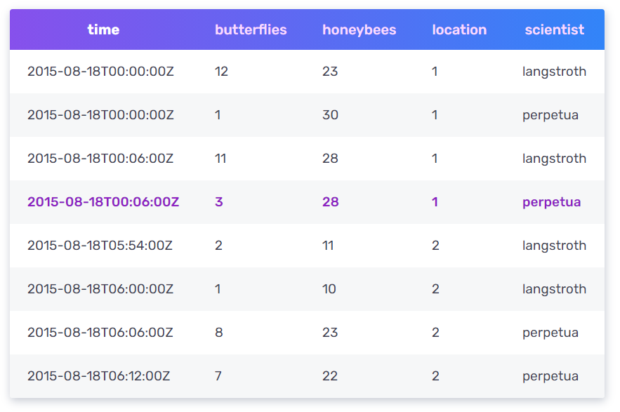 butterflies 와 honeybees의 갯수는 일반 필드이고, location 과 scientist는 tag인데 생각을 해보자!! 보통 우리는 과학자에 필터링을 걸 것어서 사용 할 것이다. scientist=perpetua 처럼 말이다. perpetua 과학자가 처리한 데이터만 골라서 보여주고 싶을 것이다. 이런 그룹짓고 싶은 필터링에 indexing을 거는 것이다 tag를 사용해서~~