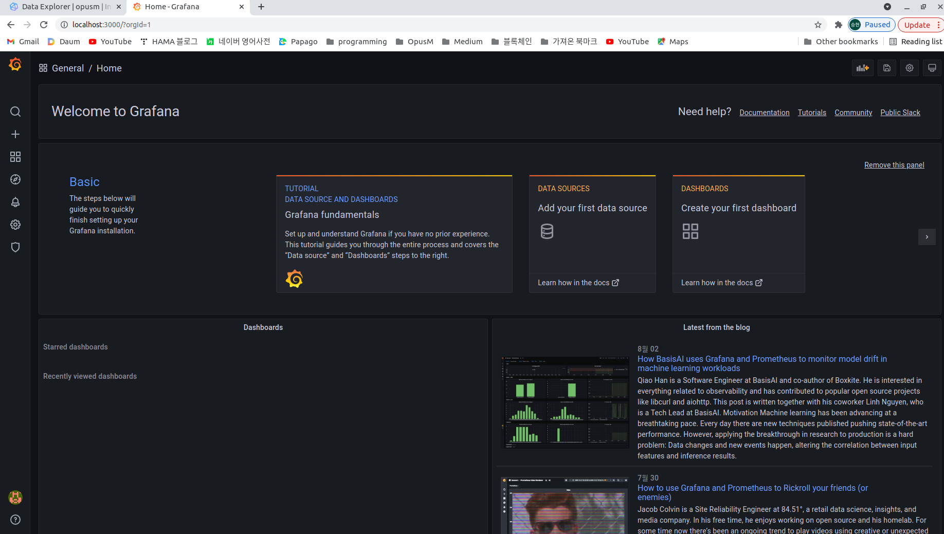 브라우저에서 다음 주소로 Grafana UI 에 들어간다. => http://localhost:3000/