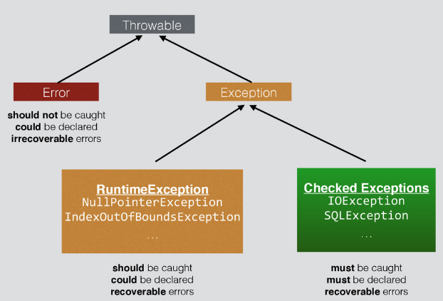 처리 할 수 없는게 도대체 무엇인걸까? 자바에서 에러는 주로 시스템 리소스 부족으로 인해 발생하는 문제이다. 그것은 문제를 알아 바짜 어떻게 개발자가 할 수 없다고 보는 것인데, 실행 시간에 발생한다. 에러의 예로는 OutOfMemoryError, LinkingError, AssertionError 등이 있다.