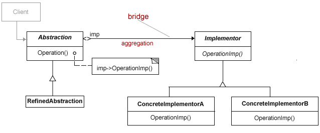 이번엔 꽤나 단순한 Bridge 패턴의 UML 이다. 별거 없지 않나? 그냥 오른쪽의 서브시스템 구현과 Client 를 Abstraction 을 이용해서 분리 시키는 것일 뿐이다. Client 는 오른쪽 서브시스템의 구현이 어떻게 변하더랴도 영향을 받지 않게 된다. 그 반대도 마찬가지~ "단순하게 구현하건 복잡하게 구현하건 의도가 그렇다면 그건 같은 패턴이된다."