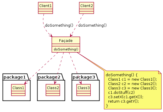 패키지가 뭐지~ 저런 화살표가 뭐지? 이런것은 잊어버리시고~ 그냥 그 느낌 그대로 해당 언어에 맞게 구현하면그게 Facade 이다. 혹시 구조가 그게 아닐까봐 눈치보지마라~ 구조가 어쨋든 상관없으니~ (언어마다 해당 언어의 이디엄이나 패러다임에 따라서 좀 달라 질 수도 있을 것이다)