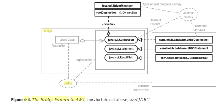 그렇다 뭔가 복잡해 보이지만 사실 그냥 중간에 Abstraction 이라는 녀석 하나 만들고 이 녀석이 다양한 구현체들을 상황에 맞춰서 유연하게~ 호출 할 수 있게 해준다는것이다. 위에서 Client 는 Java.sql.Connection 인터페이스에 대해 호출 했지만, Samba.sql.Connection 을 호출 할 수도 있겠고~ 유연함이 목적이니깐~
